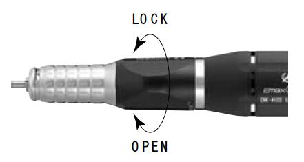 打磨筆前端上有標(biāo)注Open(打開)和Lock(鎖緊)。 采用左松右緊,左示意圖。旋轉(zhuǎn)至Open (打開)前 端夾頭會打開,可以裝夾工具。如金剛石打磨頭,各 種橡膠磨頭,各種羊毛頭等其他柄徑3mm 工具。如 需裝夾2.35mm 工具,請更換2.35mm 夾頭。打磨筆 在旋轉(zhuǎn)使用時請勿旋轉(zhuǎn)打開更換工具,這樣會損傷打 磨筆內(nèi)部。 |