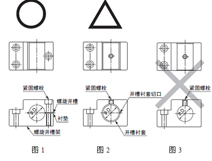 有關(guān)安裝支架上時,如圖-1所示建議使用螺旋開槽支架安裝方法。如果圖-1的方法不能安裝時,請按照圖-2的方法進(jìn)行安裝。 如圖3所示直接安裝螺絲時,會使主軸外套變形造成旋轉(zhuǎn)不良或發(fā)熱的原因. |