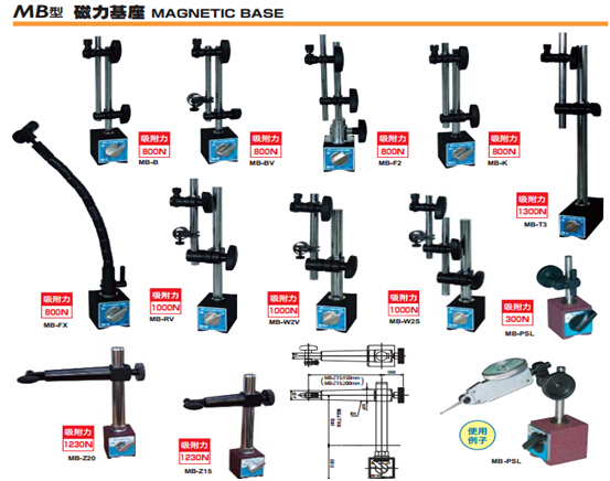應(yīng)用:日本KANETEC強(qiáng)力公司專(zhuān)業(yè)生產(chǎn)的MB系列磁性基座機(jī)床或鐵平板上,主要對(duì)機(jī)械加工工件等的尺寸進(jìn)行比較測(cè)量時(shí),如果是以千分尺方式的測(cè)量器等進(jìn)行測(cè)量(用以檢測(cè)誤差、偏差),本儀器作為測(cè)量器夾具得到廣泛使用。