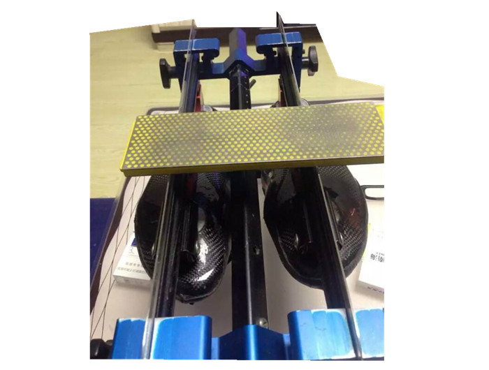 把冰刀倒著固定在架子上,四個(gè)螺母松緊要一致。檢查一下兩個(gè)冰刀前后端是否對齊,高低、垂直度是否因特殊原因而產(chǎn)生明顯的差距。有的磨刀架帶有冰刃高度固定裝置,可用之。本人的磨刀架因?yàn)闆]有這個(gè)裝置,所以找平的時(shí)候,把上好冰刀的架子倒過來,在瓷磚上找平,然后,擰死螺栓,翻過來開始磨。
