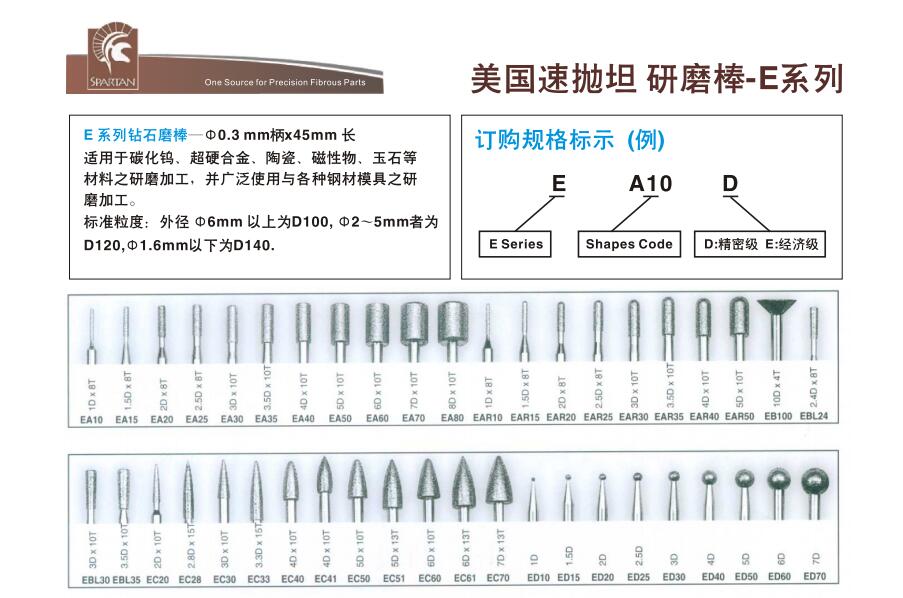 • 美國速拋坦SPARTAN拋光打磨頭適用于碳化鎢、超硬合金、陶瓷、磁性物、玉石等材料之研磨加工,并廣泛使用與各種鋼材模具之研磨加工。