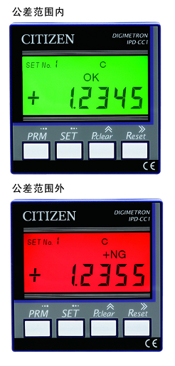 根據(jù)設定值,液晶屏幕會在綠色(OK)和紅色(NG)之間跳動,在很遠的地方就可以了解公差判定結果。