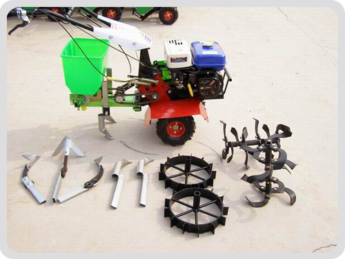 機(jī)器標(biāo)準(zhǔn)配置:一套旋耕機(jī)、一套播種施肥的作業(yè)輪、一個(gè)播種施肥耬、一個(gè)耘鋤